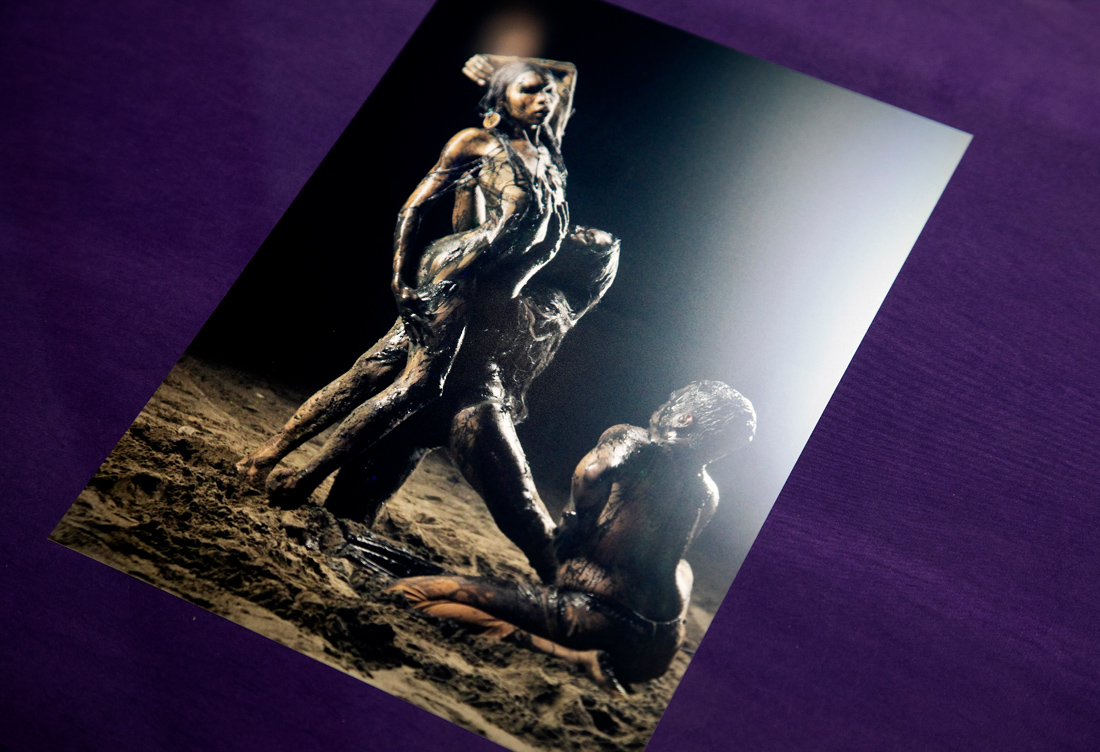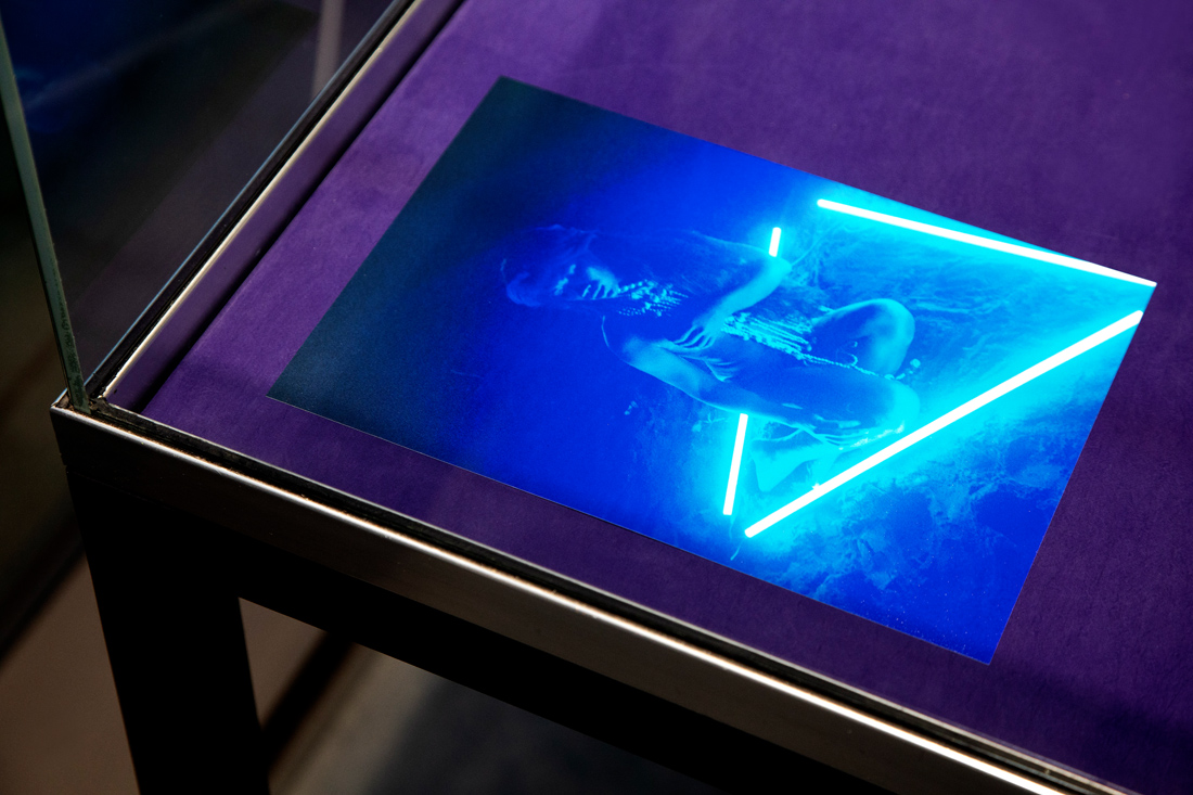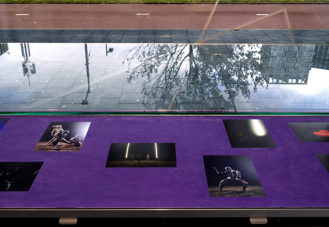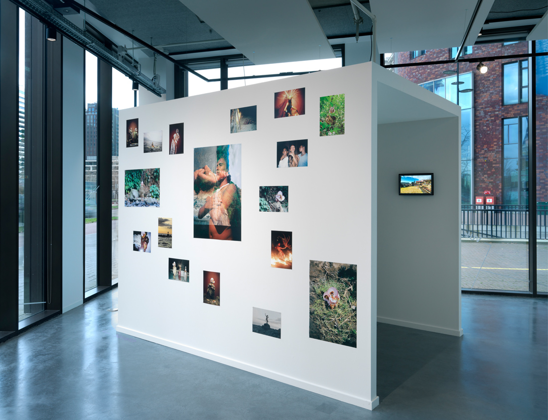 The photographs in the display cases show images of the final installations in which the performances form a relationship to a specific place and the audience. A fragment of Creation Paradigm can be seen on a screen. The photographs on the wall offer a glimpse into the working process and the creation of the final work. We see fragments of the natural environment, performers in their personal surroundings and performers in the studio with clothing and props that bring them into contact with other dimensions.