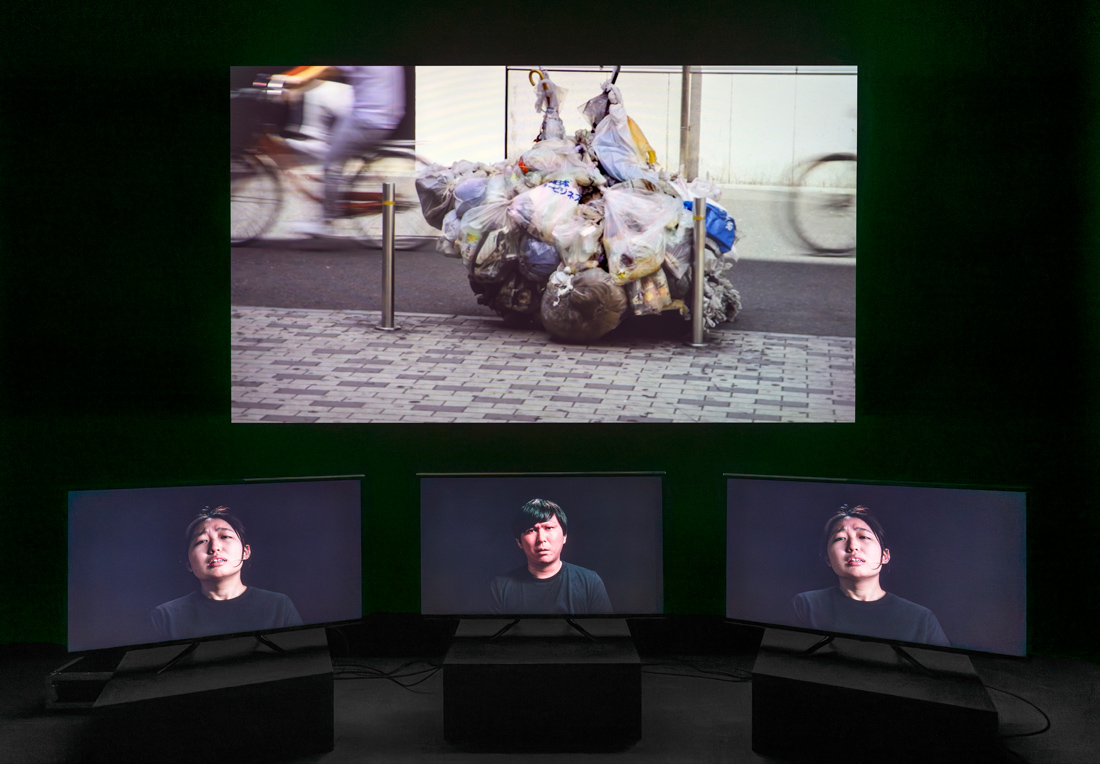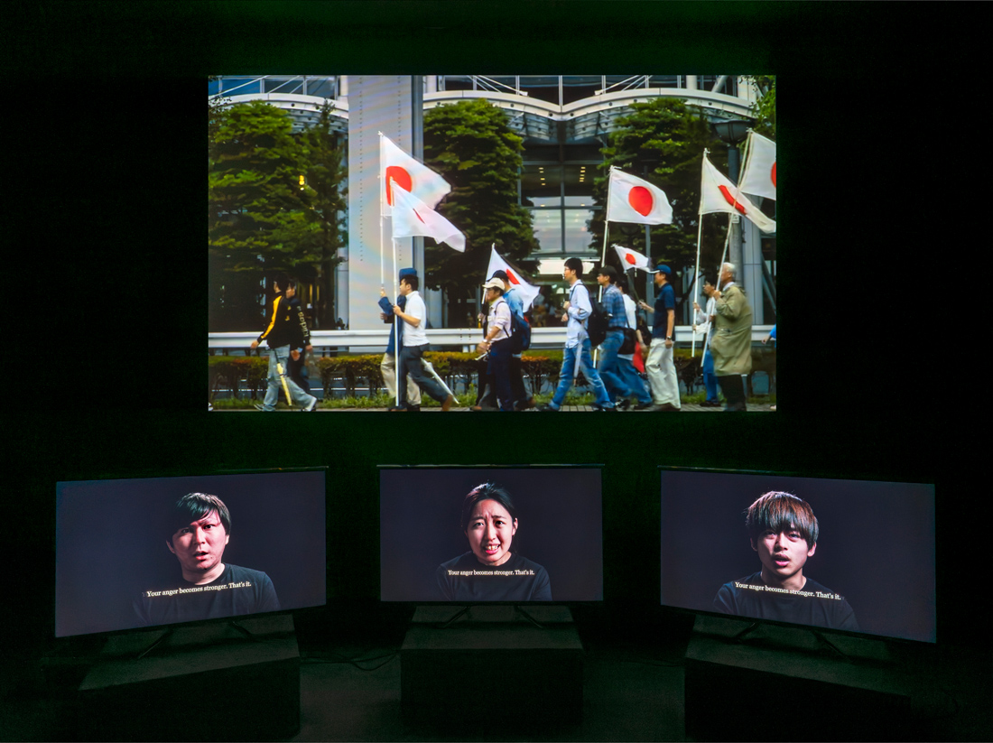 The installation shows three young Japanese people who, under hypnosis, are forced to speak out or, conversely, to remain silent. Despite the palpable tension and discomfort this causes, the voices adapt to the commands. In the background, we see a collage of image fragments of collective and national moments from public life in Tokyo that Koizumi has collected since the earthquake in 2011, such as the Olympic Games in 2021 and the mourning for the assassinated President Abe in 2022.